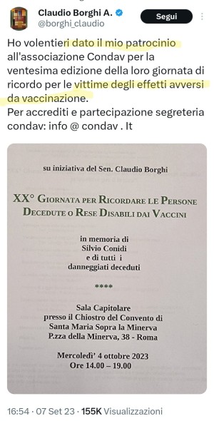 Intanto anche il leghista Borghi rincorre i no-vax, dichiarando di aver patrocinato un evento contro le vaccinazioni che salvano milioni di vite: