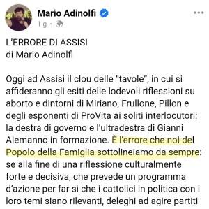 L’errore di Assisi è l’errore dei Family Day: affidarsi ai politici, quelli che affollavano le nostre manifestazioni del 2015 e 2016, ve li ricordate, da Maurizio Lupi a Giorgia Meloni? Lupi ci tradì subito perché stava già al governo e fece passare la legge Cirinnà e il testamento biologico (il primo passo verso suicidio assistito e eutanasia) per tenersi le poltrone; la Meloni si è sfilata più lentamente, i ProVita continuano ad averla come stella di riferimento, salvo poi trovarsela in campagna elettorale a gridare “non toccherò la legge 194, non toccherò le unioni gay”, poi una volta al governo con la Roccella a proporre “la sanatoria per i figli delle famiglie arcobaleno” e Fratelli d’Italia con tuttala maggioranza a votare nel gennaio 2023 a favore della mozione Pd-M5S che definisce l’aborto come “diritto intangibile della donna”. Nelle scuole dilaga la carriera alias, i leghisti fanno a gara su chi è più “moderno” con Zaia che ormai è un testimonial di aborto, suicidio assistito e eutanasia, su quel che resta di Forza Italia stendiamo un velo. Vannacci appena ha provato ad affermare qualcosa di sgradito al mondo Lgbt è stato destituito, in 24 ore, da questo governo. Non dimentichiamolo.