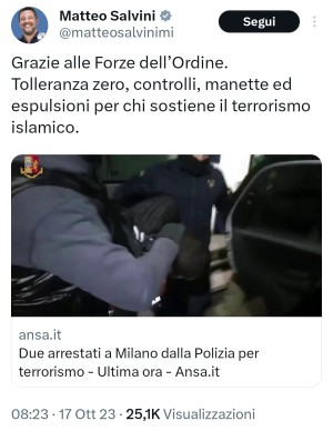 Intanto il ministro dei trasporti continua a fare il ministro degli interni, sostenendo che lui starebbe espellendo imprecisati "terroristi":