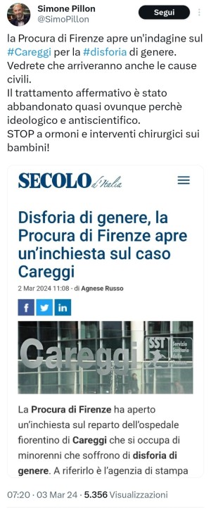 Eccitando i gruppi neofascisti, la procura di Firenze ha avviato un’indagine esplorativa (quindi senza ipotesi di reato e senza indagati) sull’ospedale Careggi, con particolare a5ttenzione alle attività del reparto che si occupa delle terapie per i minori con disforia di genere, cioè la condizione di disagio psicologico sperimentata dalle persone trans o non binarie, che non si identificano con il genere collegato al proprio sesso di nascita.