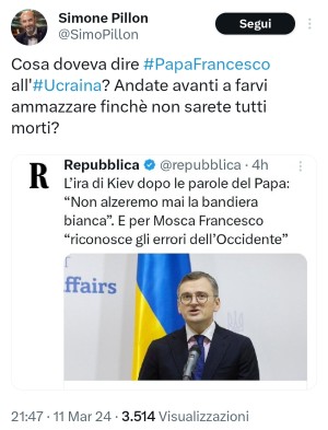 L'ex senatore leghista Simone Pillon, che in passato fu indagato perché ritenuto l'uomo che si occupava di ridistribuire i soldi di Mosca ai partiti populisti di mezza Europa, sostiene che Papa Francesco faccia bene a sostenere che gli ucraini dovrebbero arrendersi al suo Putin, perché così si sancirà che la violenza paga. Evidentemente convinto che Davide fu un cretino a non issare bandiera bianca davanti a Golia, scrive: