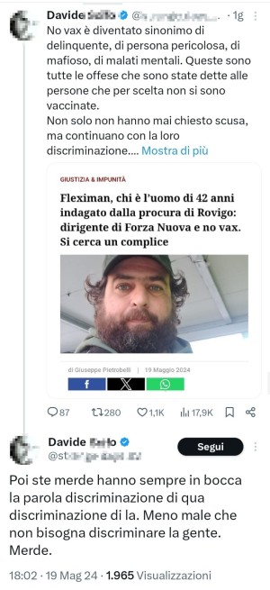 Ma mentre il signor Davide pensa che i genitori gay meritino di veder le loro fotografie trafugate e date in pasto a degli hater, diceva che il no-vax che metteva a repentaglio la salute pubblica dovesse fare ciò che gli pareva: