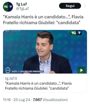 Avete presente quella fantomatica "ideologia gender" che la destra incila in ogni loro discorso, anche se poi la Meloni ha candidamente ammesso di non avere la più pallida idea di cosa diamine dovrebbe essere? Forse è un qualcosa che riguarda Giubilei, ripreso da Flavia Fratello per il suo parlare al maschile delle donne: