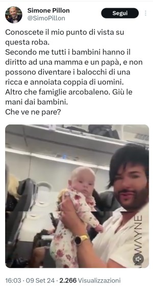Voi dareste mai un figlio a Simone Pillon? Perché se lui sostiene che gli omofobi abbiano ogni diritto di aiutarlo a molestare e insultare i genitori i gay che lui mette alla gogna sul suoi profili sicial, allora non dovrebbe essere altrettanto lecito esprimere liberamente le proprie opinioni riguardo alla sua famiglia? Oppure lui vuole rispetto senza essere disposto a concederlo agli altri, magari confidando sul fatto che difficilmente degli stranieri potranno denunciarlo per diffamazione aggravata?