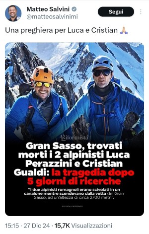 Salvini si getta sui cadaveri dei due alpinisti morti