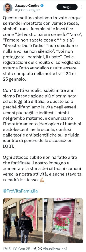 Perché un barbuto signore che chiede che venga begato il diritto all'esistenza delle donne trans, che nega rispetto alle famiglie gay, che schiuma per i diritti delle donne e che promuove un'agenda politica a dir poco m liberticida parrebbe aver inferto molto più di quanto ha subito, dato che una serranda si lava mentre una vita danneggiata sarà segnata per sempre.