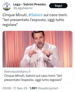 Giusto ieri Salvini ha deciso di sostenere che i ritardi dei treni sarebbero tutta colpa di imprecisati sabotatori, che causerebbero guasti per fargli dispetto. Già oggi cerca di sostenere che il semplice fatto che questa mattina non ci siano stati disservizi dovrebbe dargli ragione, dato lui avrebbe risolto tutto facendo presentare un esporto al gruppo FS: