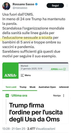 La Lega esulta perché il loro Donald Trump ci danneggerà tutti, facendo uscire gli Stati Uniti d'America dall'Oms con la scusa di vedere presunte disparità nei finanziamenti verso la Cina. In particolare, il leghista Sasso propone di emularlo al fine di far felici i no-vax e tutti quei gruppi integralisti che si oppongono ad una sana educazione sessuale nelle scuole: