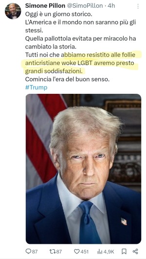 Pillon sostiene anche che ci sarebbe la mano di Dio dietro l'uccisione dell'adolescente repubblicano che dicono avrebbe tentato di sparare al leader del partito da lui supportato, regalandogli le elezioni. E da bun falso "sovranista", è certo che le elezioni americane avranno effetto anche in Italia. Più opinabile è il suo affermare che Trump sarebbe espressione di "buonsenso" dopo che fece assaltare il campidoglio da persone vestite come unni.