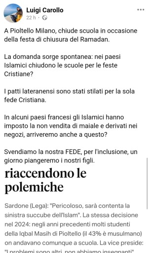 Tanto ha eccitato il solito pastore evangelico Luigi Carollo, il quale non ha perso tempo ad andarle dietro manco volesse aiutarla ad abusare del nome di Gesù come strumento di propaganda sovranista atto ad imporre il proprio predominio agli altri. E così, annuncia che l'evangelico dovrebbe chiedere alla sua Giorgia meloni di calpestare i nostri principi costituzionali perché lui sarebbe certo che i mussulmani farebbero lo stesso: