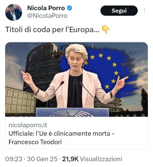 Se pare evidente che Porro sogna una Meloni con pieni poteri che posa rincorrere il suo profitto elettorale senza curarsi di regolamenti internazionali o di diritti umani, , altresì evidente è che il loro disprezzo per l'Europa derivi da un disprezzo per i diritti. Non vogliono chi chiede meno inquinamento, chi difende i ragazzi dal bullismo economico o chi mette in discussione il loro essere convinti che essere bianchi ed eterosessuali dovrebbe risultare fonte di privilegi esclusivi. E dato che l'ideologia populista non sa costruire nulla, dato che è capace solo di distruggere, lui dice che bisognerebbe compiacersi se leghisti italiani e neonazisti tedeschi hanno vandalizzato il futuro delle nuove generazioni.