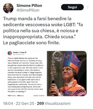 Insomma, il leghista fa capire che nulla lo renderebbe più felice di una bella dittatura in cui agli atri sia vietato dissentire dal loro pensiero unico. E pur di genuflettersi ai deliri di Trump, arriva ad attaccare un vescovo che, citando Cristo, ha esortato alla pietà e alla misericordia nei confronti di immigrati e transgender.