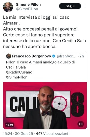 Il leghista Simone Pillon è stato ospite di Francesco Borgonovo su Radio Cusano Campus, dove ha tentato di sostenere che Giorgia Meloni avrebbe fatto benissimo a scarcerare ed offrire un volo di stato pagato dai contribuenti ad un tagliagole libico responsabile di omicidi e torture. Assicura lo avrebbe fatto per il bene della nazione e come dispetto a chi chiedeva la scarcerazione di Cecilia Sala: