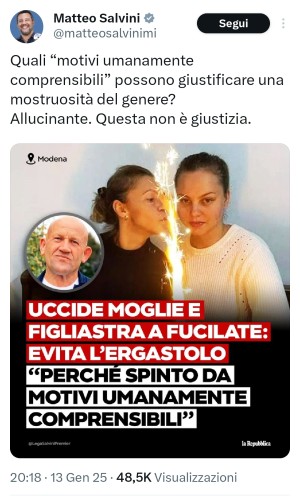 Naturalmente, Salvini non ha avuto la decenza di ricordare che la sentenza è stata emanata da una Corte d'Assise, la quale è composta da otto giudici, di cui solo due sono magistrati. Ma la realtà non sarebbe stata utile alla sua campagna denigratoria contro la magistratura. E forse, 30 anni di carcere per un 70enne non fanno grande differenza, anche se Salvini parrebbe sempre ambire alla massima pena tranne quando sono i leghisti a finire in tribunale o bisogna sentenziare sui 49 milioni rubati agli italiani dal suo partito.