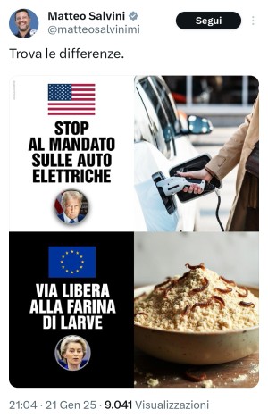 A giudicare dal tenore del messaggio, tutto fa pensare che Salvi sia favorevole all'inquinamento statunitense e contrario alla produzione di cibo sostenibile. Ed ovviamente la cosiddetta "farina di larve" non è certamente quella del suo disegnino.