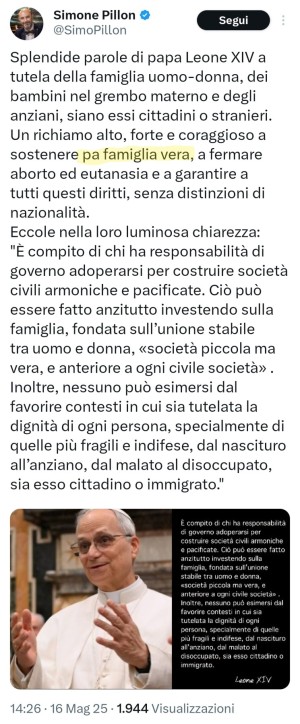 In realtà Pillon ha un po' rigirato il discorso secondo convenienza, evitando di sottolineare le parole di Leone XIV riguardo alla dignità dei migranti.