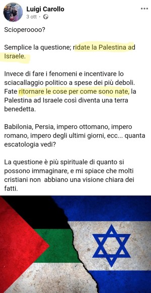 Il pastore evangelico Luigi Carollo pare furioso con chi ha rinunciato ad un giorno di paga per manifestare a sostegno dei palestinesi. E parrebbe odiare a morte anche chi ha messo a repentaglio la propria incolumità per cercare di portare aiuti a bambini che morivano di fame.