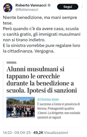Il leghista Roberto Vannacci pare eccitato dalle scuole pubbliche che impongono preghiere cristiane ai bambini mussulmani in violazione alle nostre leggi e ai nostri principi costituzionali. In fondo, ogni forma di sopraffazione, discriminazione e violenza sui minorenni pare rendere felici i suoi elettori e si tramuta in una fonte di facili profitti per le sue tasche.