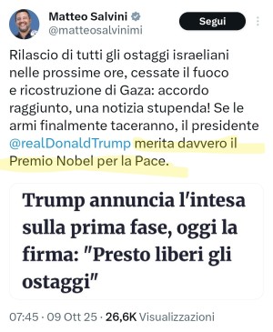 Quindi, se Hiler avesse aiutato una vecchietta ad attraversare la strada, avremmo dovuto dare il Nobel pure a lui? E davvero Salvini dà ancora credito ai poco attendibili annunci di Trump?Ad esempio, il 15 agosto scorso diede diede due settimane a Putin per negoziare con l'Ucraina, ma ad ottobre nulla è cambiato.