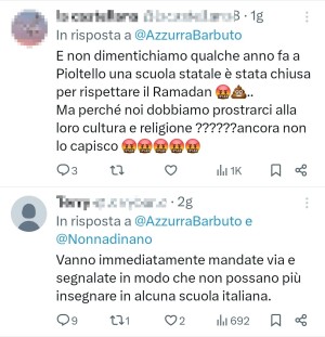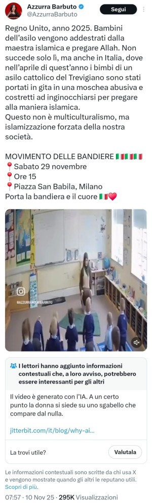 La signora Azzurra Barbuto appare molto impegnata nella promozione dell'odio etnico e religioso, in un evidente vilipendio del Tricolore che lei continua a usare come simbolo della sua ideologia incostituzionale. Nonostante ci abbia ormai abituato alla sistematica pubblicazione di bufale e fake-news, parrebbe essersi superata nel pubblicare un finto video realizzato artificialmente: