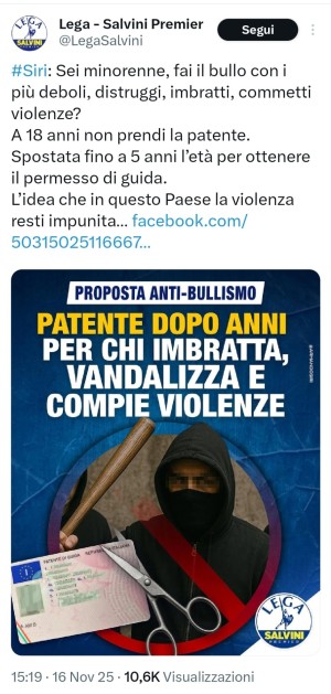 Salvini promette punizioni per tutti, tranne che per chi ruba 49milioni di euro agli italiani, per i ministri che truffano l'Inps o per chi sequestra migranti. E così, oggi dice che lui non darà la patente a chi protesta contro i genocidi o viene accusato di essere violento. Peccato non si capisca quale dovrebbe essere il nesso tra causa ed effetto...