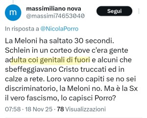 Ci fosse giustizia, il signor Massimiliano dovrebbe essere portato in tribunale a spiegare il perché della sua calunnia, finalizzata all'istigazione all'odio. Ma siamo in Italia e l'odio è il motivo con cui la destra cerca voti mentre aumenta le accise e regala dazi ai loro alleati d'oltreoceano...