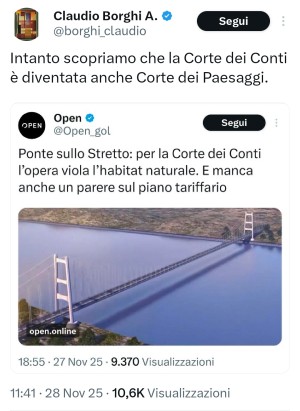Il leghista Claudio Borghi elargisce pillole di economia, climatologia, virologia e su migliaia di altri temi. Però sostiene che ai giudici andrebbe vietato di poter osservare che costruire una opera mastodontica in un luogo ad alto valore naturalistico danneggi l'habitat.