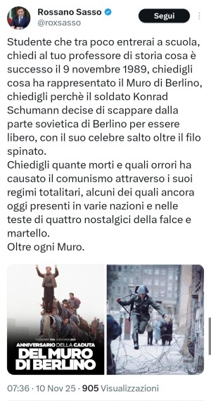 Magari si potrebbe insegnare agli studenti che a chiedere nuovi muri sono Trump, Orban e Salvini. E magari si potrebbe chiedere a Sasso di spiegarci in quali Paesi vedrebbe ancora vivo un comunismo paragonabile a quello dell'Unione Sovietica.