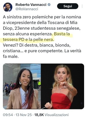 Roberto Vannacci è diventato vicesegretario della Lega senza alcuna esperienza politica o merito specifico, ma solo perché cercava di fare soldi facili con un aberrante libro omofobo e razzista che piaceva ai fascisti e agli intolleranti. Però dice che il chilometrico curriculum di Mia Diop non sarebbe sufficiente, perché è nera e dunque va insultata e usata per santificare la bianchissima Beatrice Venezi, figlia di un dirigente di CasaPound che ha ottenuto un prestigiosissimo incarico pubblico dopo aver suonato ai comizi di Giorgia Meloni: