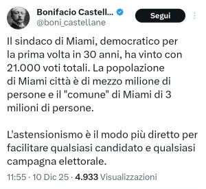 Se ieri si lamentava perché il sindaco di New York andrà a vivere nella residenza dei sindaci anziché in una casa senza acqua corrente come gli immigrati promossi da Salvini, oggi prova a sostenere che le elezioni più partecipate ultime tornate elettorali di Miami avrebbero fatto vincere il candidato a lui sgradito solo perché nessuno sarebbe andato a votare:
