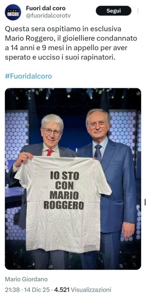 Intanto il suo Mario Giordano ha invitato alla sua trasmissione un uomo che ha rincorso e ucciso due persone, sostenendo che l'omicidio dovrebbe essere ritenuto legittimo:
