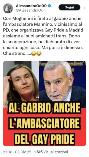 L'espressione "finito al gabbio" è per ridicolizzare chi viene indagato anziché invocare l'impunità come certi ministri accusati di frode all'Inps. E il suo dire che organizzava Gay Pride a Madrid assieme ai suoi amichetti trans" è una nota omofoba che probabilmente si riferisce al ruolo di Stefano Sannino come Ambasciatore d'Italia in Spagna (Madrid) dal 2016 al 2021, periodo in cui è probabile che abbia partecipato o sostenuto eventi come il Gay Pride, coerentemente con il ruolo diplomatico e le politiche di inclusione.