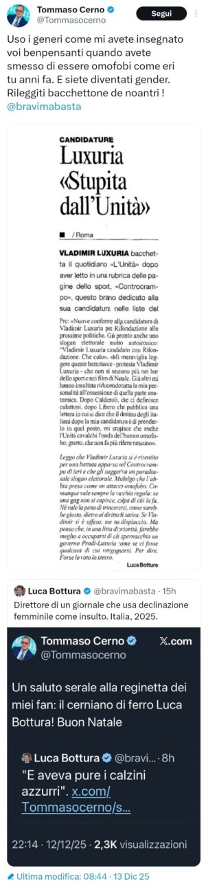 Oggi Cerno ha eccitato il portavoce dell'organizzazione forzanovista Provita Onlus (che le donne trans le chiama al maschile con il dichiarato intento di offenderle), accusando Bottura di essere omofobo perché anni fa avrebbe usato un termine che i suoi usano tutti i giorni. Ne conclude che chi non fa battute omofobe sarebbe "gender":