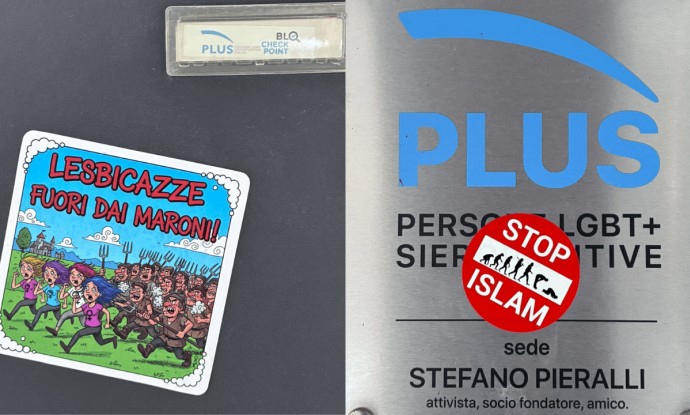 Bologna, omofobo imbrattano la sede di Plus ap con adesivi omofobi e islamofobi