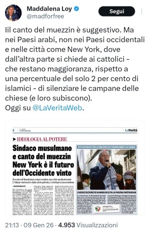 Come nolti redattori di Maurizio Belpietro, anche la signora Maddalena Loy parrebbe convinta che il "cristianesimo" sia uno strumento di sopraffazione, utile a produrre profitti mediante l'odio religioso. Così il razzista sarà portato a pagare dazi e accise a chi si arricchisce promettendo deportazioni e ingiustizie sociali.