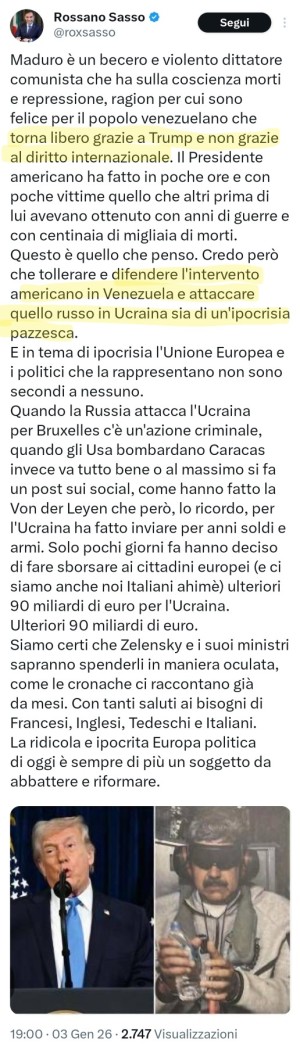 Probabilmente solo un leghista potrebbe oensare che Trump non agisca per interessi personali. Ma Sasso parrebbe essere sempre dalla parte dei prepotenti, suggerendo sarebbe giusto uccidere chi non piace alla destra populista...