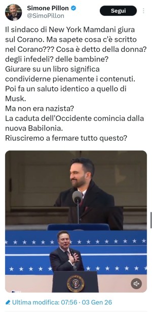 Patetico è che sostenga sua "nazista" perché faceva "ciao ciao" con la mano anziché tenerla tesa come il suo adorato Musk. E forse dovrebbe sapere che Si giura sulla Costituzione o sul libro della propria fede religiosa. Pillon sarà ignorante o in malafede?