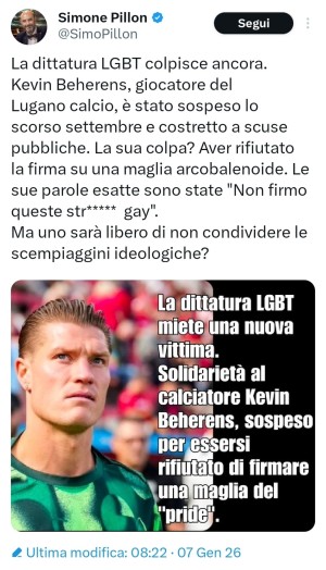 Pillon riesuma una vicenda del 2024, compiacendosi davanti al gesto omofobo di Kevin Behrens