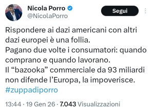 Quindi cosa propone? Diamo a Trump tutte le nazioni che chiederà? Gli paghiamo i suoi dazi perché quando è lui a chiederli andrebbero bene?