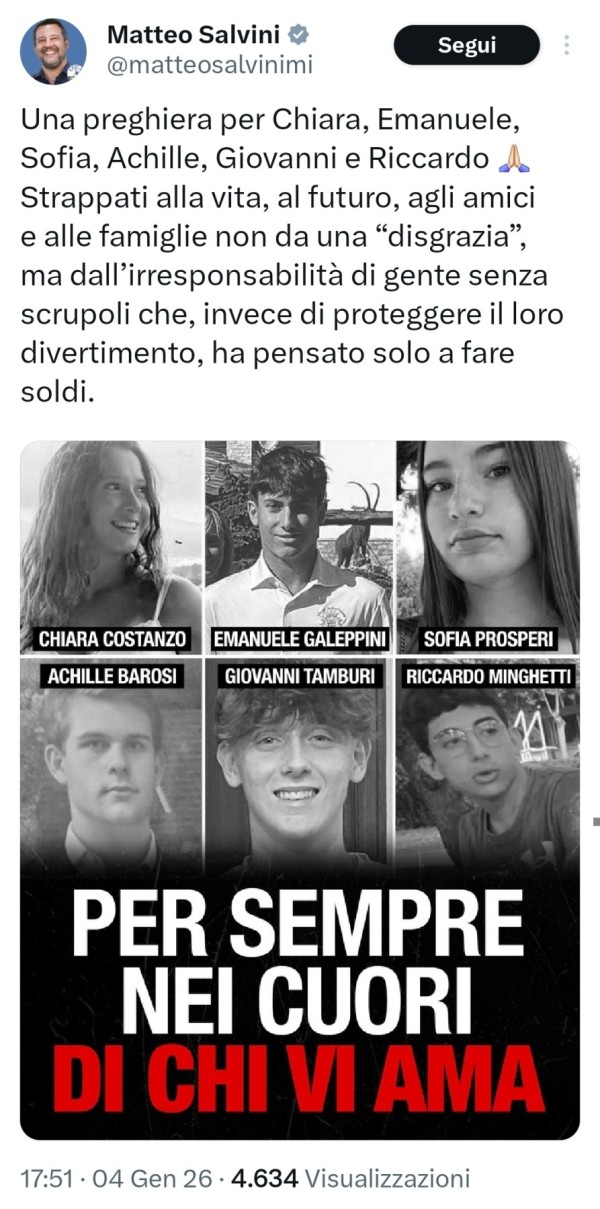 Pensa forse che usare i corpi di Chiara, Achille, Sofia, Emanuele, Giovanni e Riccardo possa portargli profitto? E perché non prega mai quando a morire sono ragazzini migranti, spesso come conseguenza delle sue politiche?