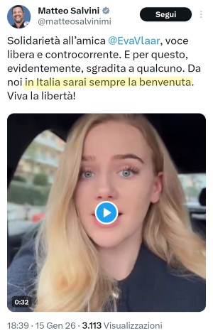 Il ministro Matteo Salvini parrebbe pronto a spalancare le porte dell'Italia a chiunque voglia macchiassi di propaganda xenofoba, esprimendo solidarietà alla sua "amica" olandese che promuove l'ideologia Maga e chiede deportazioni etniche.