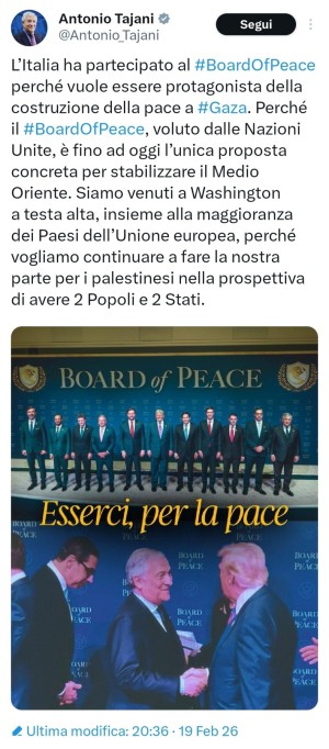 Il ministro Tajani pare mentire agli italiani nel dichiarare che il Board of peace sarebbe stato voluto dall'ONU. Peccato sia stata un'iniziativa di Donald Trump, che probabilmente mira unicamente ad accopparsi i possibili profitti della ricostruzione.