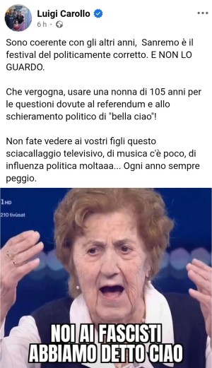 La condanna del nazifascismo dovrebbe essere un valore universale e condiviso, ma il pastore evangelico Luigi Carollo si dice furioso con una donna ultracentenaria che dal palco di Sanremo ha ricordato la cacciata dei fascisti.