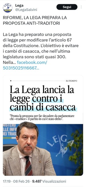 La destra sta praticamente riscrivendo la nostra Costituzione. Se Giorgia Meloni vuole il controllo della Magistratura, Salvini vorrebbe abolire l'elezione dei rappresentanti e sancire che il partito debba prevalere sulle persone. In pratica, vuole vendicarsi di Vannacci e abolire il principio per cui vincolo di mandato viene instaurato tra eletti ed elettori. Così facendo, a giudicare l'operato dei politici non sarebbe più più l'elettore ma il partito. Ossia lui, nel caso della Lega: