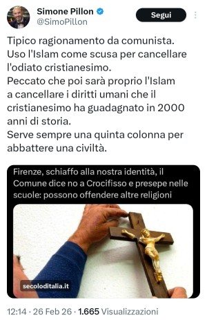 Simone Pillon ama sostenere che il maschio eterosessuale bianco avrebbe il pieno diritto di indottrinare i propri figli all'odio omofobico, rivendicando tale scelta come una "priorità educativa del genitore". Ma poi, però, vorrebbe imporre ai figli degli altri i simboli della propria confessione religiosa.