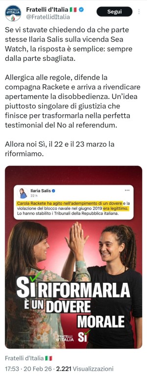 Il partito di Giorgia Meloni sostiene che chi non sta con lei dalla parte dei genocidi, dei campi di deportazione e dei migranti in mare andrebbe accusato di essere dalla "parte sbagliata". Quindi sarebbe "dovere morale" aiutare i politici a poter approvare leggi illegali in odio verso chi è stata detenuta senza processo dal suo amato Orban.