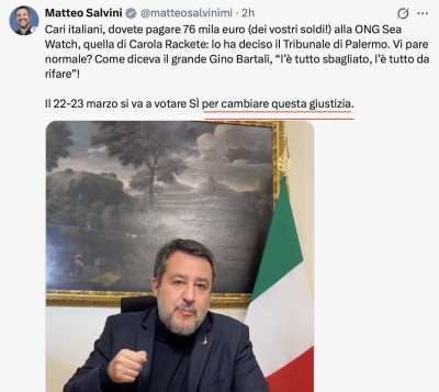O Salvini non ha capito cosa si vota al referendum costituzionale o sta mentendo ai suoi elettori. Non si cambia la giustizia: la riforma non incide sul merito delle decisioni. Quindi, anche dopo la riforma, risarcimenti come quello alla Sea Watch 3 continueranno a essere disposti.