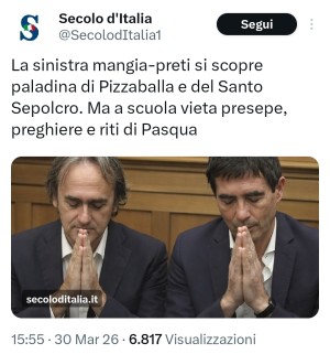 La destra de Il Secolo d'Italia parrebbe avere una strana concezione della libertà religiosa. Dicono che solo chi è di estrema destra meriterebbe di essere ritenuto "cristiano" in virtù di come vorrebbero riempire le scuole di crocefissi in odio verso i mussulmani. Di contro, gli altri dovrebbero tacere quando il loro genocida preferito impedisce la preghiera in luoghi adibiti al culto.
