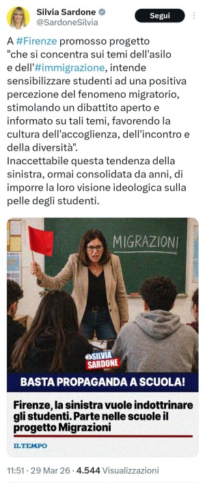 Silvia Sardone parrebbe campare di odio verso i migranti. Esulta quando vengono uccisi propone deportazioni violente e urla che Gesù va usato come simbolo identitario di legittimazione alla discriminazione.