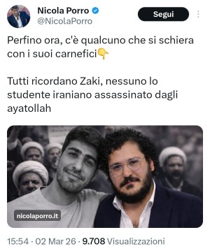 Forse Nicola Porro non lo sa, ma quel ragazzo si chiamava Yasin Mirzaei. E difficilmente lo conosceranno i suoi lettori, dato che lui non lo ha mai nominato sui suoi canali social: